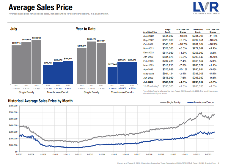 The median price for a single family home in the Las Vegas Valley went up $6,000 in July, going from $444,000 the previous month to $450,000. This matches the first time since last July that the median price has been the same or higher year over year, after experiencing a small price decrease from August 2022 to December 2022. The average sales price is also up year over year, from $549,950 last month to $569,962 in July 2023 (a 4.6% increase from last year).