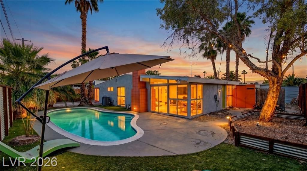 A preserved example of Mid-Century Modern architecture in historic Paradise Palms ? Las Vegas's first master-planned community and Clark County's first designated historic overlay district. This Palmer & Krisel-era single-story retains its original architectural language: floor-to-ceiling glazing, exposed beam ceilings, a sculptural orange block fireplace, period-correct aqua interiors, and the signature carport-and-screen entry. The rear elevation opens to a kidney-shaped pool framed by an orange tile chimney and mature palms ? hallmarks of the Stardust Country Club era. Updates include a galley kitchen with marble countertops and stainless appliances, and two renovated baths finished in subway tile with contemporary vanities. Minutes from the Strip, UNLV, Harry Reid International, and Las Vegas National Golf Course. A rare offering in one of Southern Nevada's most architecturally significant neighborhoods.